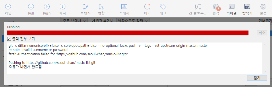 그러나 소스트리를 이용한 Push는 여전히 되지 않으며 해결 방법은 간단했다.
