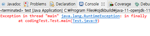 - 마찬가지로 catch블록이 수행 중에 return을 만나도 finally블록의 문장들은 수행된다.