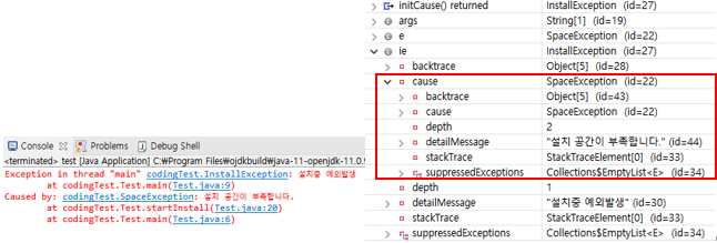 - initCause을 통해 예외의 원인을 지정된 값(참조변수 e)으로 초기화 함으로써 SpaceException인스턴스의 정보가 저장되었다.