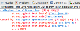 - 그래서 startInstall( ) 매서드 선언부의 throws에 선언하지 않아도 된다. initCause( )대신 RuntimeException의 생성자를 사용했다. [RuntimeException (Throwable cause) //원인 예외를 등록하는 생성자]