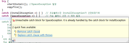 - 만약 이전의 예외에서 startInstall( )에서 발생한 예외를 직접 처리하도록 코드를 수정해보았다. startInstall( )의 첫번째 if문인 if(!enoughSpace())에서 예외가 발생하여 적절한 catch문을 찾아 ‘설치 공간이 부족합니다’를 출력하였다. 그리고 해당 try-catch문을 빠져나오기에 두번째 if문은 실행되지 않았다.