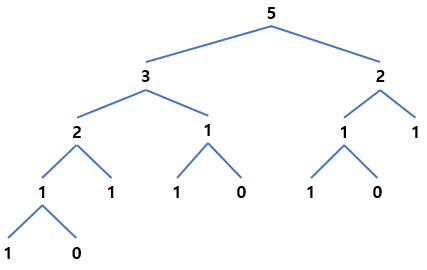 이런 식으로 현재 차례(N)에서 N-1, N-2의 차례 값을 재귀 함수로 호출하며 N의 값이 0 또는 1이 나올 때까지 수행합니다.