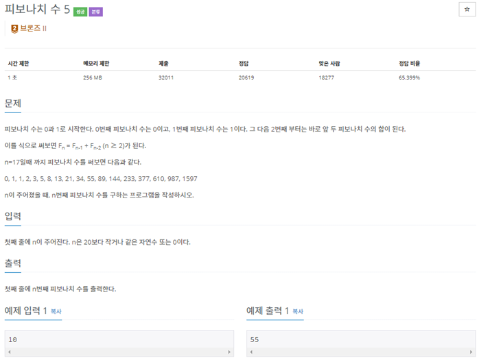 피보나치 수는 문제에 있듯이 0과 1로 시작하며 다음 피보나치 수는 바로 앞의 두 피보나치 수의 합이 됩니다.