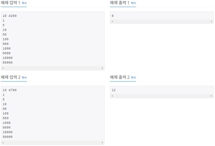 첫째 줄에 N과 K가 주어진다. (1 ≤ N ≤ 10, 1 ≤ K ≤ 100,000,000) 둘째 줄부터 N개의 줄에 동전의 가치 Ai가 오름차순으로 주어진다. (1 ≤ Ai ≤ 1,000,000, A1 = 1, i ≥ 2인 경우에 Ai는 Ai-1의 배수)