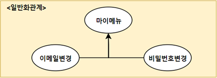 클래스의 상속과 비슷한 의미로 유사한 유스케이스 또는 액터를 그룹화시켜 이해도를 높이기 위해 표현하는 관계입니다.
